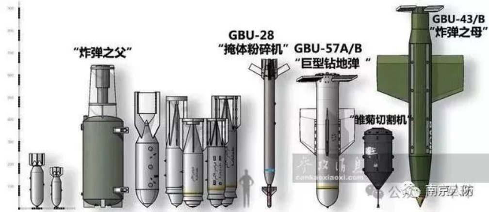 ▲MOP全重14吨,是美军现役最重常规航弹,远超8.5吨级的GBU-43B“炸弹之母”(MOAB)燃料空气炸弹,同时还是美军现役武库中钻地能力最强的非核炸弹。