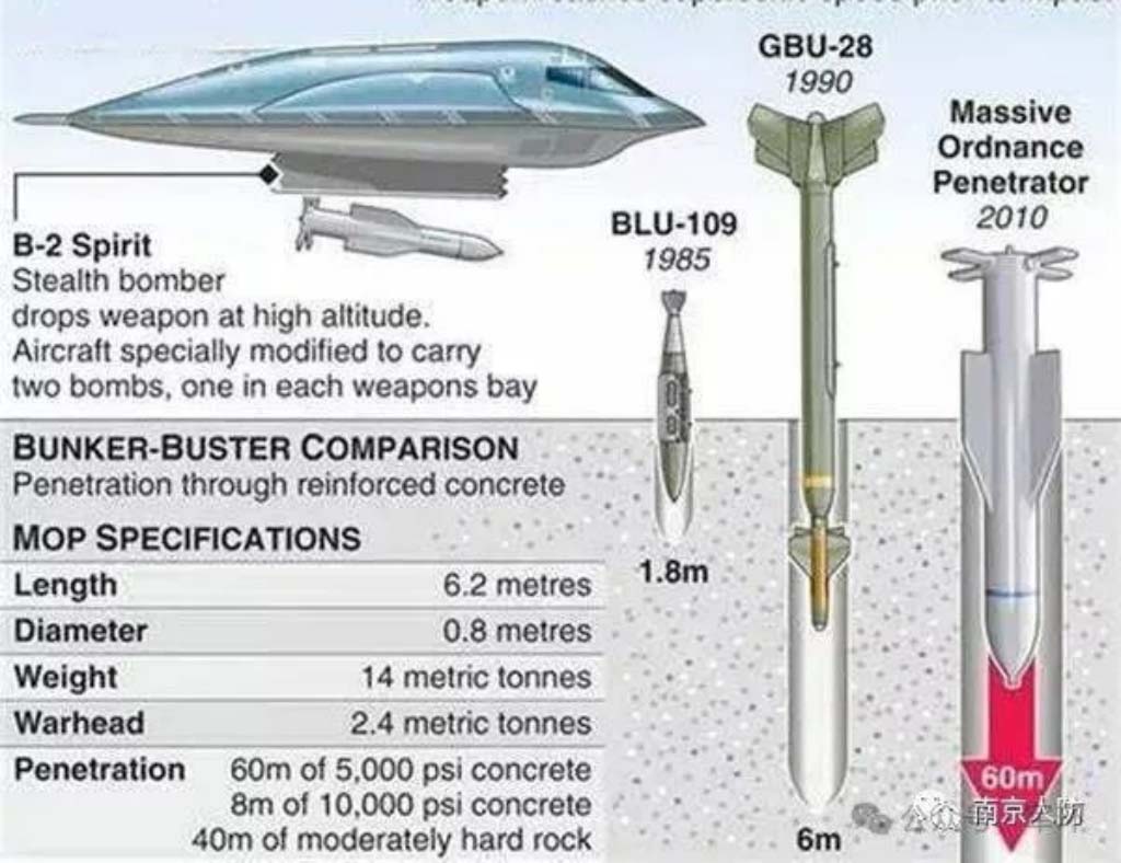 ▲MOP钻地弹内装2.7吨高爆炸药,可在穿透多层混凝土或岩层后,于预定深度引爆,对地下掩体具有巨大破坏力。如图所示,MOP钻地弹的钻深远超早期的BLU-109和GBU-28钻地弹。